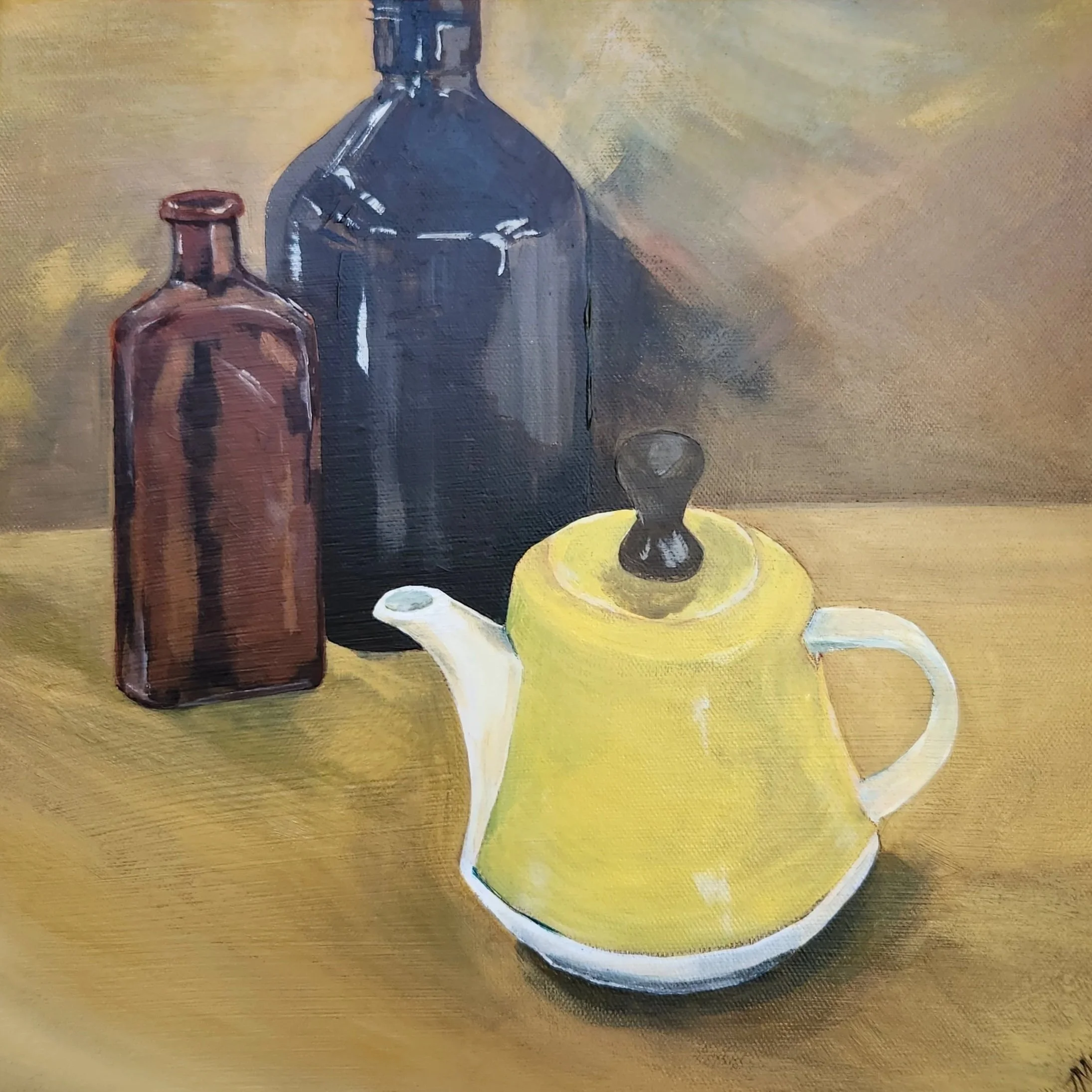 Emily gave me this little teapot for our children to play with. By some miracle it survived numerous teaparties with her three grandchildren. The brown bottles are admiring onlookers.